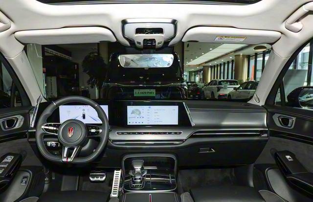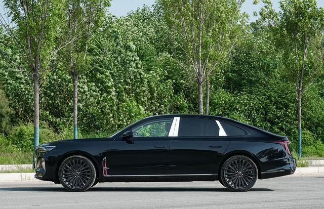 再来看车身侧面部分,超过5.1米的车长与3.06米轴距,赋予H9修长而稳重的侧影。溜背式车顶线条从B柱缓缓下坠,既保留行政车的端庄,又增添运动气息。隐藏式门把手与双色车身设计(顶配标配)进一步强化高级感,可选香槟金/琥珀棕等配色,在光影流转间彰显东方含蓄之美。腰线采用“旗迹”设计理念,从前大灯贯穿至尾灯,配合19英寸多辐轮毂,静止时也呈现蓄势待发的姿态。不过需注意,高车头设计对新手不太友好,狭窄路段建议依赖360全景影像辅助。