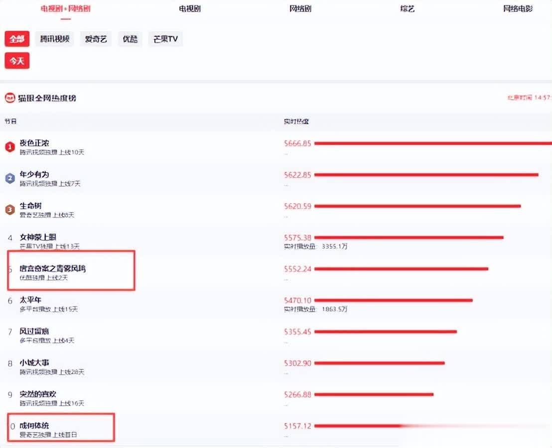 《成何体统》的站内热度,六千多,而《唐宫奇案之青雾凤鸣》八千多。
