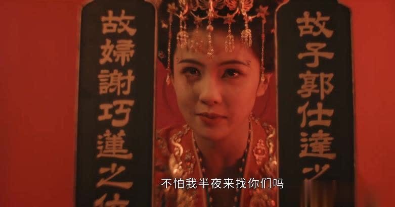 穿着嫁衣的李佩仪,在牌位前,用翻白眼的姿势,装恐怖,观感一般。